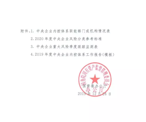 建立健全企業(yè)內(nèi)控體系是中央企業(yè)管理提升的重要基礎(chǔ),是促進中央企業(yè)守住不發(fā)生系統(tǒng)性風險底線、加快實現(xiàn)高質(zhì)量發(fā)展的有力舉措,對增強國有經(jīng)濟競爭力、創(chuàng)新力、控制力、影響力、抗風險能力具有十分重要的意義。各中央企業(yè)要高度重視內(nèi)控體系建設(shè)與監(jiān)督工作,加強組織領(lǐng)導,落實企業(yè)主要領(lǐng)導人員內(nèi)控體系監(jiān)管工作第一責任人職責,盡快明確專門職能部門或機構(gòu),配備必要專門人員,建立使全上下貫通、全面覆蓋的內(nèi)控工作體系,形成領(lǐng)導有力、職責明確、流程清晰、規(guī)范有序的工作機制。各中央企業(yè)要按照《實施意見》有關(guān)要求,于2020年1月20日前將內(nèi)控體系職能部門或機構(gòu)設(shè)置情況(見附件1)報送國資委。
