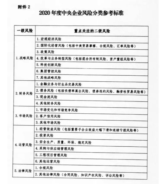 各中央企業(yè)要認真做好年度重大風險評估工作,根據(jù)國內(nèi)外經(jīng)濟運行動態(tài)、大宗商品價格以及資本市場等形勢變化,結(jié)合《2020年度中央企業(yè)風險分類參考標準)(見附件2)及企業(yè)自身實際情況,科學準確識別、評估、預判企業(yè)面臨的重大風險,并于2020年2月底前將重大風險評估情況報經(jīng)董事會或類似決策機構(gòu)審議通過。建立健全重大風險季度監(jiān)測和報告工作機制,經(jīng)確認造成重大資產(chǎn)損失的風險事件,應(yīng)當在5個工作日內(nèi)報告國資委;密切跟蹤應(yīng)對年初評估的重大風險變化情況,及時發(fā)現(xiàn)和應(yīng)對經(jīng)營管理過程中的新增風險和風險事件,按季度匯總分析各類重大風險應(yīng)對措施和重大風險事件監(jiān)測處理情況,并按要求報送國資委(見附件3)。