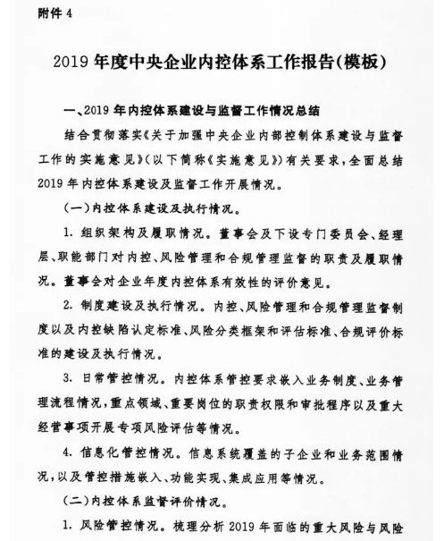 各中央企業(yè)要以“強內(nèi)控、防風險、促合規(guī)”為目標,進一步整合優(yōu)化內(nèi)控、風險管理和合規(guī)管理監(jiān)督工作,按一體化要求編制2019年度內(nèi)控體系工作報告(見附件4),不再分別報送《中央企業(yè)內(nèi)部控制評價報告》和《中央企業(yè)年度風險管理報告》。相關(guān)材料要經(jīng)企業(yè)董事會或類似決策機構(gòu)審議通過,由企業(yè)主要領(lǐng)導人員簽字并加蓋公章后于2020年4月30日前報送國資委,同時抄送企業(yè)紀委(紀檢監(jiān)察組)、組織人事部門。各中央企業(yè)要認真落實本通知各項工作要求,切實做好2020年內(nèi)控體系建設(shè)與監(jiān)督工作,并按時將有關(guān)報表和報告(紙質(zhì)文件一式兩份和電子文檔)報送國資委綜合監(jiān)督局。國資委將對《實施意見》執(zhí)行情況、經(jīng)營管理重要領(lǐng)域和關(guān)鍵環(huán)節(jié)內(nèi)控體系有效性以及整改落實工作成效開展監(jiān)督檢查,對未按規(guī)定履行內(nèi)控體系工作職責、隱匿不報、整改不到位等問題,按照有關(guān)規(guī)定進行提示、通報或嚴肅追責問責。
