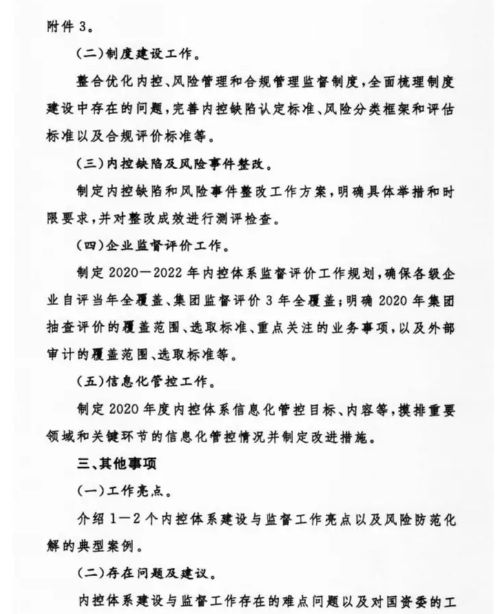 各中央企業(yè)要以“強內(nèi)控、防風險、促合規(guī)”為目標,進一步整合優(yōu)化內(nèi)控、風險和合規(guī)管理相關(guān)制度,完善內(nèi)控缺陷認定標準風險評估標準和合規(guī)評價標準,構(gòu)建相互融合、協(xié)同高效的內(nèi)控監(jiān)管制度體系。聚焦關(guān)鍵業(yè)務(wù)、改革重點領(lǐng)城、國有資本運營重要環(huán)節(jié)以及境外國有資產(chǎn)監(jiān)管,全面梳理查找企業(yè)管控制度和流程缺陷,對未體現(xiàn)國家法律法規(guī)等外部監(jiān)管規(guī)定,缺乏內(nèi)控要求和風險應(yīng)對措施,不符合不相容職務(wù)分離控制、授權(quán)審批控制等相關(guān)要求,專項風險評估、內(nèi)控體系監(jiān)督評價、責任追究制度規(guī)定不健全等情形,要于2020年底前完成相關(guān)制度修訂增補工作。