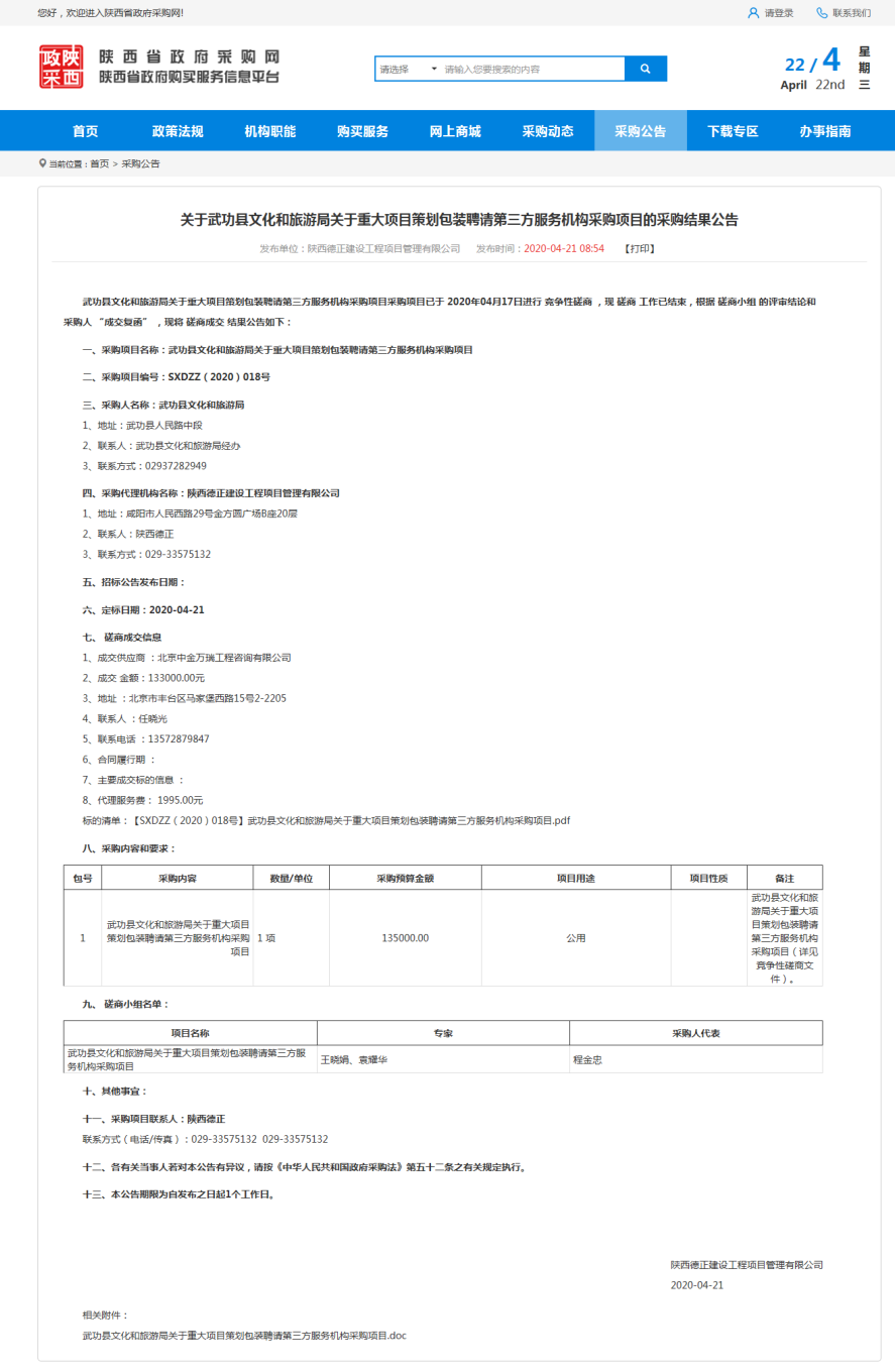 2020年4月21日陜西省政府采購網(wǎng)發(fā)布于武功縣文化和旅游局關(guān)于重大項(xiàng)目策劃包裝聘請第三方服務(wù)機(jī)構(gòu)采購項(xiàng)目的采購結(jié)果公告,北京中金萬瑞工程咨詢有限公司成功中標(biāo)。 北京中金萬瑞工程咨詢有限公司(簡稱中金萬瑞)是全國57家工程咨詢甲級綜合資信企業(yè)之一,擁有專業(yè)資信甲級8項(xiàng)、PPP專項(xiàng)資信甲級和綜合資信甲級(所有專業(yè)規(guī)劃咨詢和評估咨詢)。公司是國際咨詢工程師聯(lián)合會(huì)(FIDIC)、中國工程咨詢協(xié)會(huì)的會(huì)員單位。 在項(xiàng)目謀劃領(lǐng)域,公司組建有項(xiàng)目謀劃和包裝策劃的專業(yè)研究團(tuán)隊(duì),依托公司投資項(xiàng)目庫和六大服務(wù)平臺(tái)的資源優(yōu)勢,為各級政府、投資者提供區(qū)域投資項(xiàng)目謀劃、投資項(xiàng)目包裝策劃、投資項(xiàng)目庫建設(shè)、項(xiàng)目投融資方案設(shè)計(jì)等咨詢服務(wù)。 在前期咨詢領(lǐng)域,公司憑借工程咨詢甲級綜合資信的隊(duì)伍及實(shí)力,為項(xiàng)目單位提供項(xiàng)目建議書、可行性研究報(bào)告、項(xiàng)目申請報(bào)告、資金申請報(bào)告、節(jié)能報(bào)告、PPP項(xiàng)目咨詢、社會(huì)穩(wěn)定風(fēng)險(xiǎn)評估、項(xiàng)目實(shí)施方案、項(xiàng)目評估評審等咨詢服務(wù)。