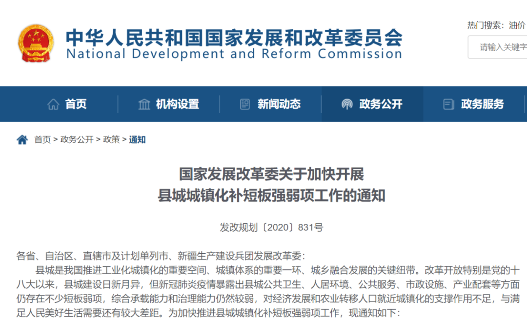 國家發(fā)展改革委關(guān)于加快開展縣城城鎮(zhèn)化補短板強弱項工作的通知