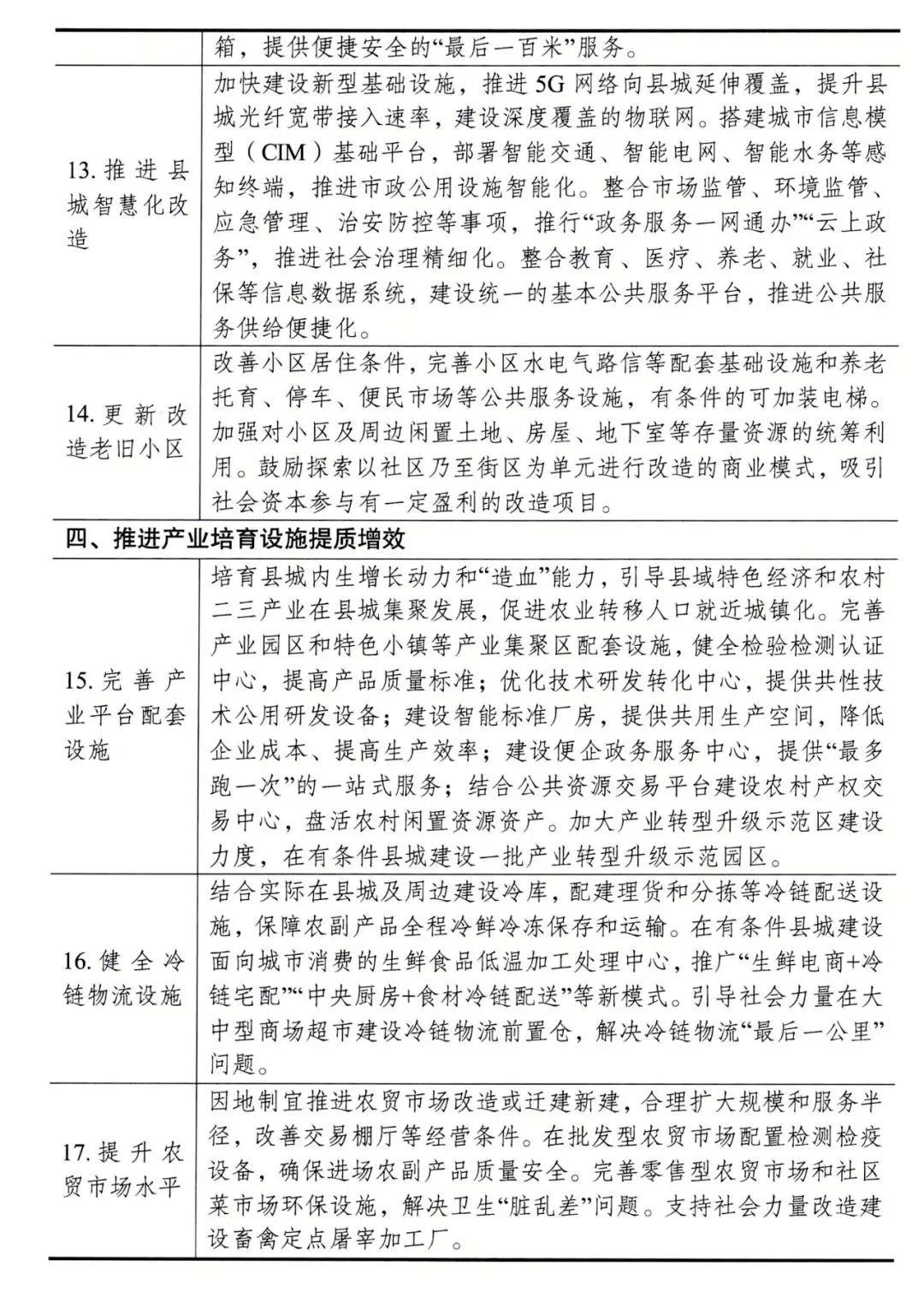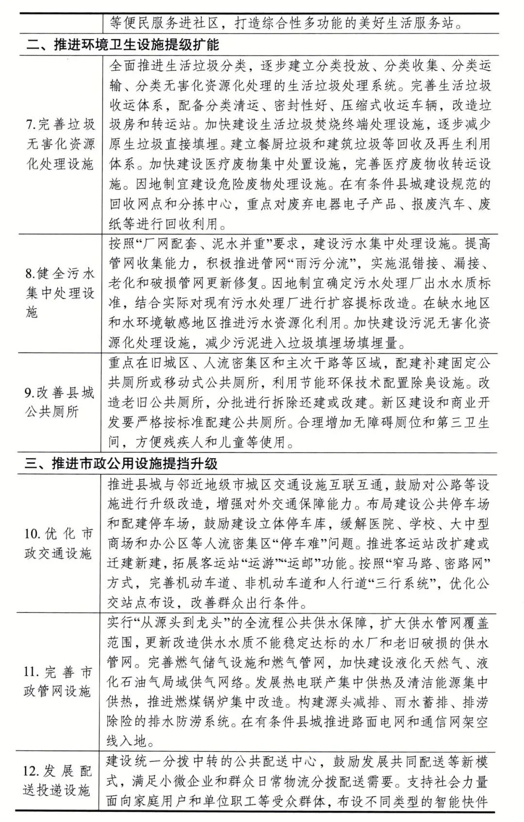 三是推進市政公用設(shè)施提擋升級,含5項建設(shè)任務(wù)。在優(yōu)化市政交通設(shè)施方面,主要是建設(shè)公共停車場、改造客運站、完善市政道路“三行系統(tǒng)”等。在完善市政管網(wǎng)設(shè)施方面,主要是更新改造水廠和老舊破損供水管網(wǎng)、完善燃氣儲氣設(shè)施和燃氣管網(wǎng)、集中改造燃煤鍋爐、推進路面電網(wǎng)和通信網(wǎng)架空線入地等。在發(fā)展配送投遞設(shè)施方面,主要是建設(shè)公共配送中心、布設(shè)智能快件箱等。在推進縣城智慧化改造方面,主要是建設(shè)新型基礎(chǔ)設(shè)施、搭建縣城智慧化管理平臺等。在更新改造老舊小區(qū)方面,主要是完善水電氣路信等配套基礎(chǔ)設(shè)施和養(yǎng)老托育、停車、便民市場等公共服務(wù)設(shè)施。