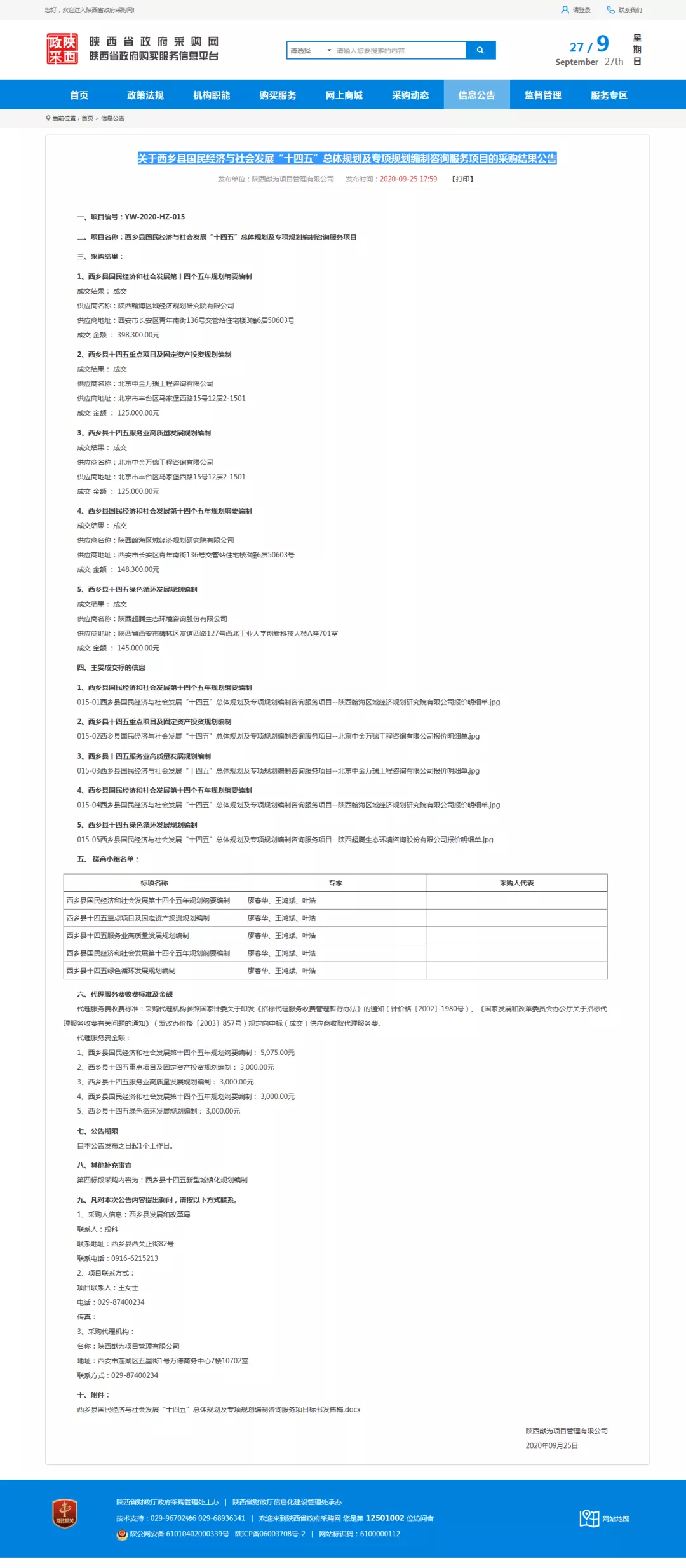 2020年9月25日,陜西省政府采購網(wǎng)發(fā)布《關(guān)于西鄉(xiāng)縣國(guó)民經(jīng)濟(jì)與社會(huì)發(fā)展“十四五”總體規(guī)劃及專項(xiàng)規(guī)劃編制咨詢服務(wù)項(xiàng)目的采購結(jié)果公告》,我公司成功中標(biāo),中標(biāo)金額250,000.00元。