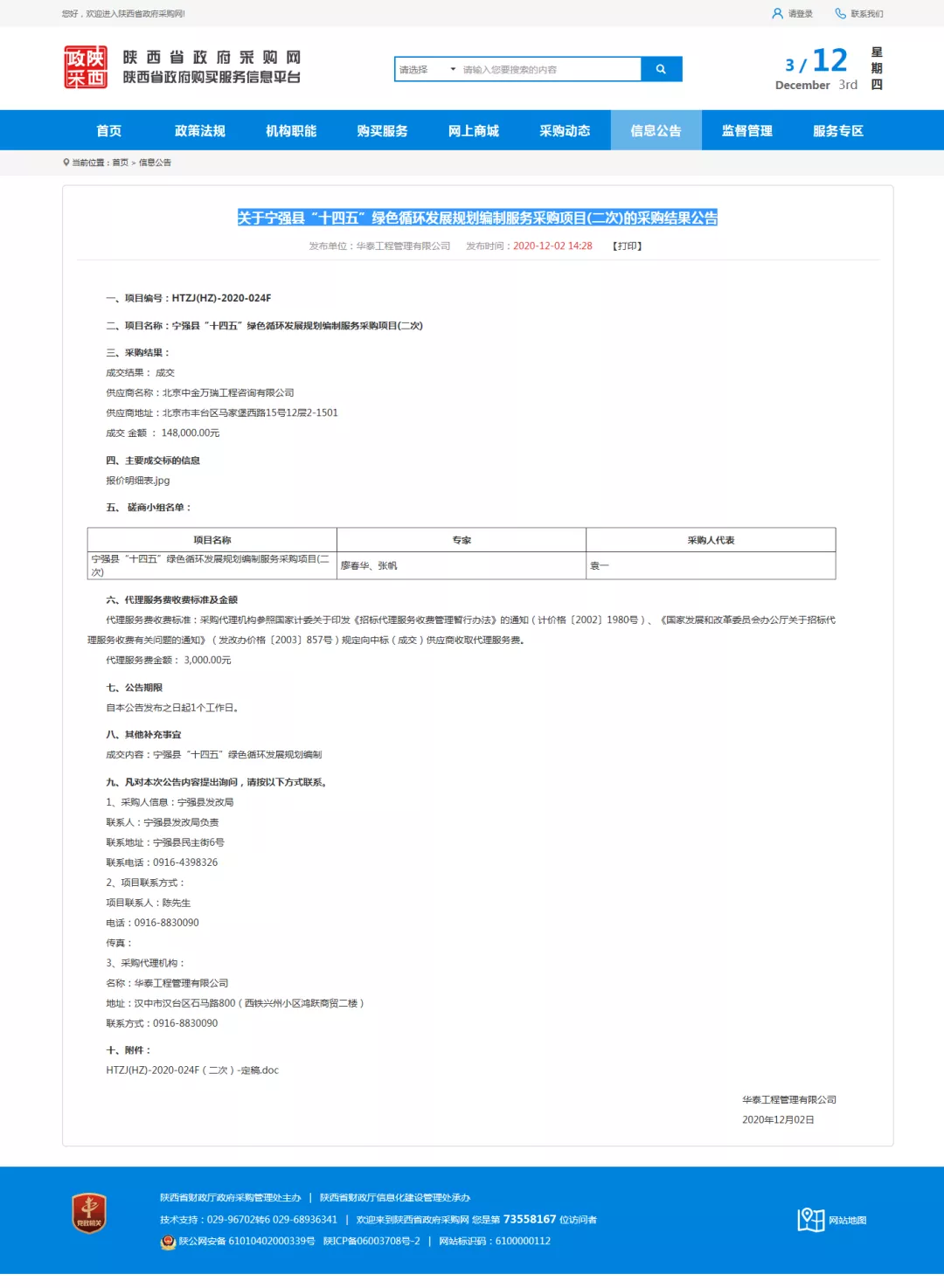 2020年12月2日,陜西省政府采購網(wǎng)發(fā)布《關(guān)于寧強縣“十四五”綠色循環(huán)發(fā)展規(guī)劃編制服務(wù)采購項目(二次)的采購結(jié)果公告》,我公司成功中標,中標金額148,000.00元。