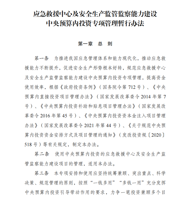 ??為規(guī)范和加強中央預(yù)算內(nèi)投資管理,進一步提高中央預(yù)算內(nèi)投資使用效率,根據(jù)有關(guān)法律法規(guī)和規(guī)范性文件,特制定《應(yīng)急救援中心及安全生產(chǎn)監(jiān)管監(jiān)察能力建設(shè)中央預(yù)算內(nèi)投資專項管理暫行辦法》?,F(xiàn)印發(fā)給你們,請按照執(zhí)行。