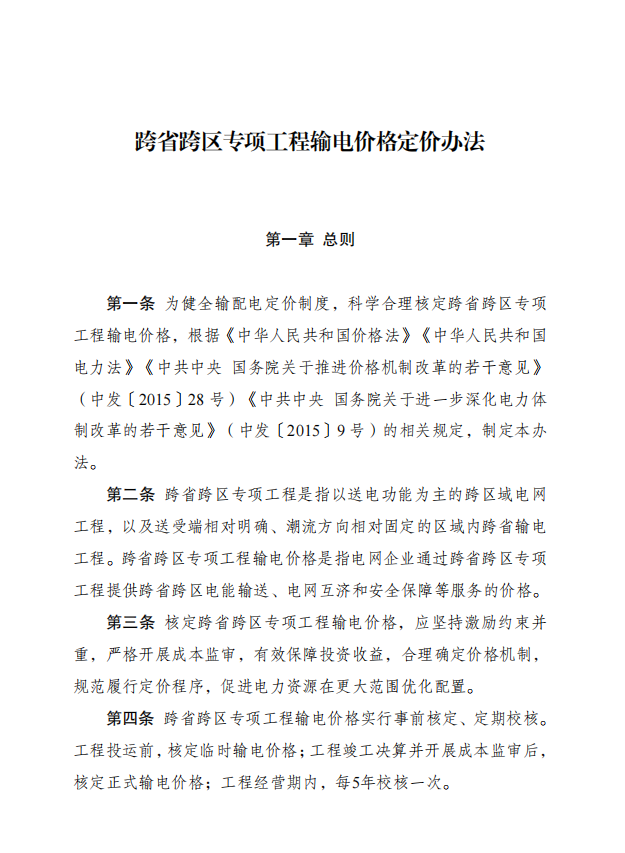 ??為貫徹落實中共中央、國務院《關于進一步深化電力體制改革的若干意見》、《關于推進價格機制改革的若干意見》要求,加快深化電價改革,進一步提升跨省跨區(qū)專項工程輸電價格核定的科學性、合理性,經(jīng)商國家能源局,我們對2017年出臺的《跨省跨區(qū)專項工程輸電價格定價辦法(試行)》(發(fā)改價格規(guī)〔2017〕2269號)作了修訂,形成了《跨省跨區(qū)專項工程輸電價格定價辦法》?,F(xiàn)印發(fā)你們,請按照執(zhí)行。
