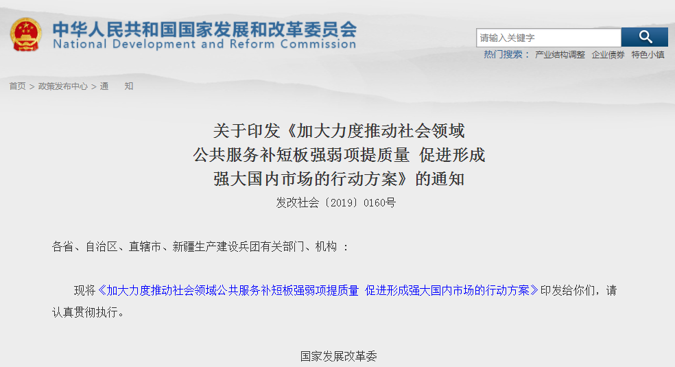 關(guān)于印發(fā)《加大力度推動社會領(lǐng)域公共服務(wù)補短板強弱項提質(zhì)量促進形成強大國內(nèi)市場的行動方案》的通知發(fā)改社會〔2019〕0160號...