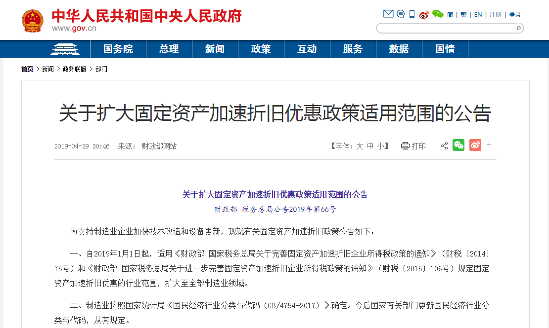 關(guān)于擴大固定資產(chǎn)加速折舊優(yōu)惠政策適用范圍的公告財政部稅務(wù)總局公告2019年第66號為支持制造業(yè)企業(yè)加快技術(shù)改造和設(shè)備更新,...