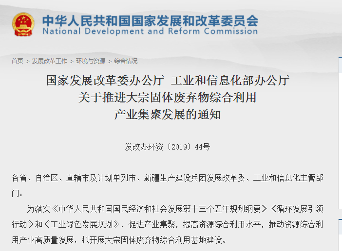 國家發(fā)展改革委辦公廳工業(yè)和信息化部辦公廳關(guān)于推進大宗固體廢棄物綜合利用產(chǎn)業(yè)集聚發(fā)展的通知發(fā)改辦環(huán)資〔2019〕44號各省、...